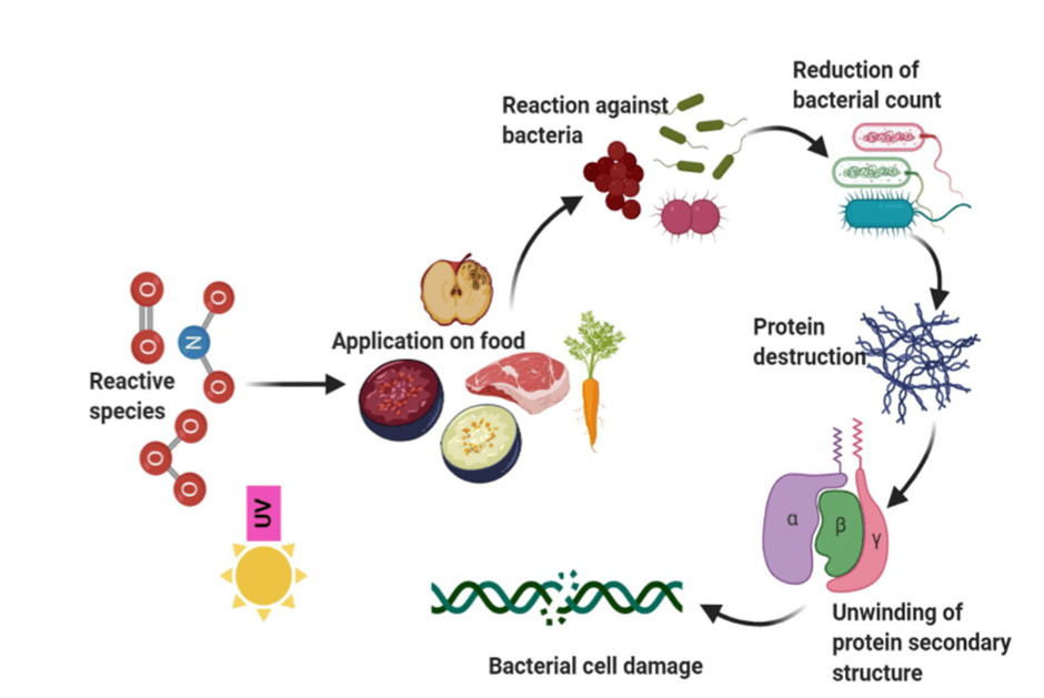 Cold plasma works to kill microorganisms using three key methods. First, it uses reactive particles, radicals, or charged molecules to damage the cell membranes through chemical reactions. Second, the UV light produced by the plasma harms both the outer membranes and internal parts of the cells. Lastly, when the plasma particles recombine, they generate UV light that can break the DNA inside the microorganisms, preventing them from functioning properly. These processes make cold plasma an effective tool for microbial inactivation (Ansari et al., 2022).