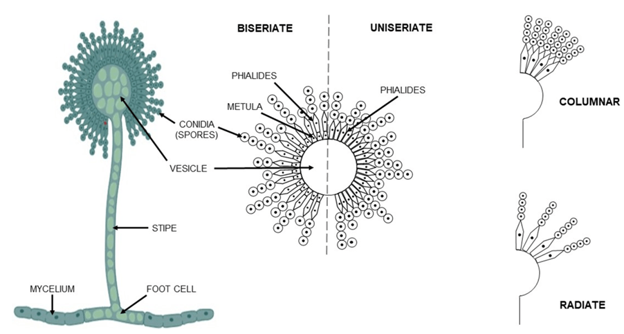 Figure 1. The morphological variations of Aspergillus species, including uniseriate or biseriate arrangements (Sharma et al., 2025).